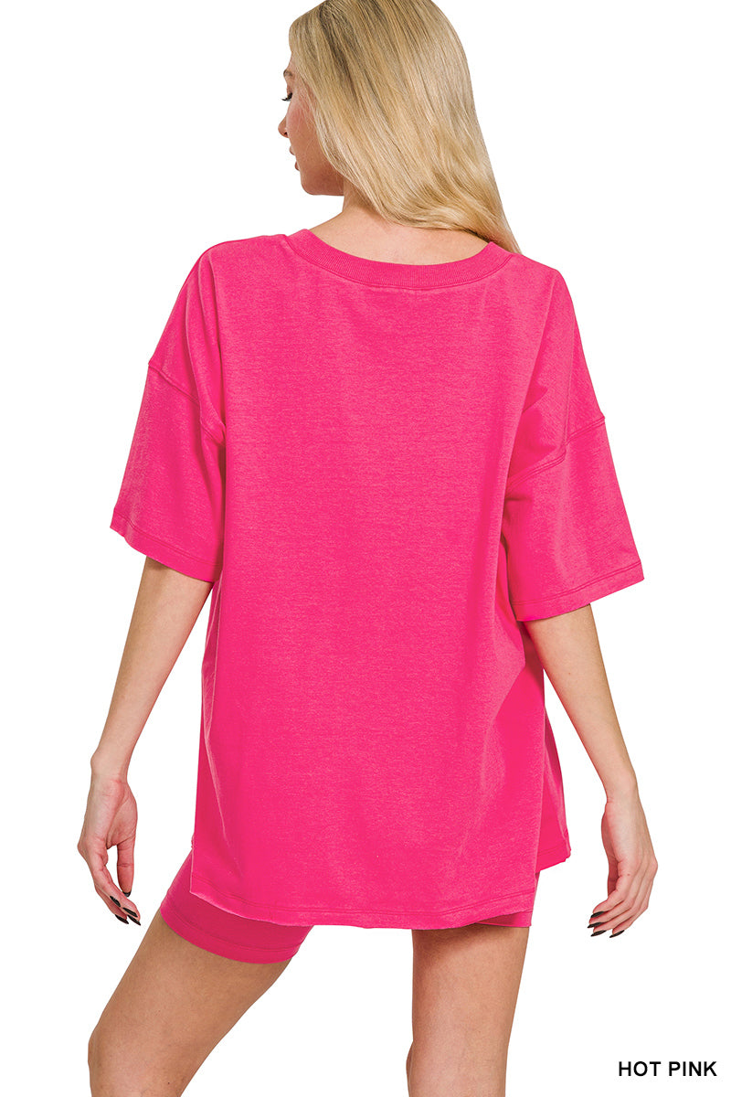 The Zenana Lounge Set presents a technically designed cotton ensemble featuring a V-neck top with raglan sleeves and raw edge finishing, paired with coordinating biker shorts. Technical specifications include a 28" body length and 49" bust for the top, with shorts measuring 22" at waist and 6.75" inseam (small size measurements). Cambodian-manufactured using a precision-engineered 95% cotton/5% spandex composition for optimal comfort-stretch ratio.